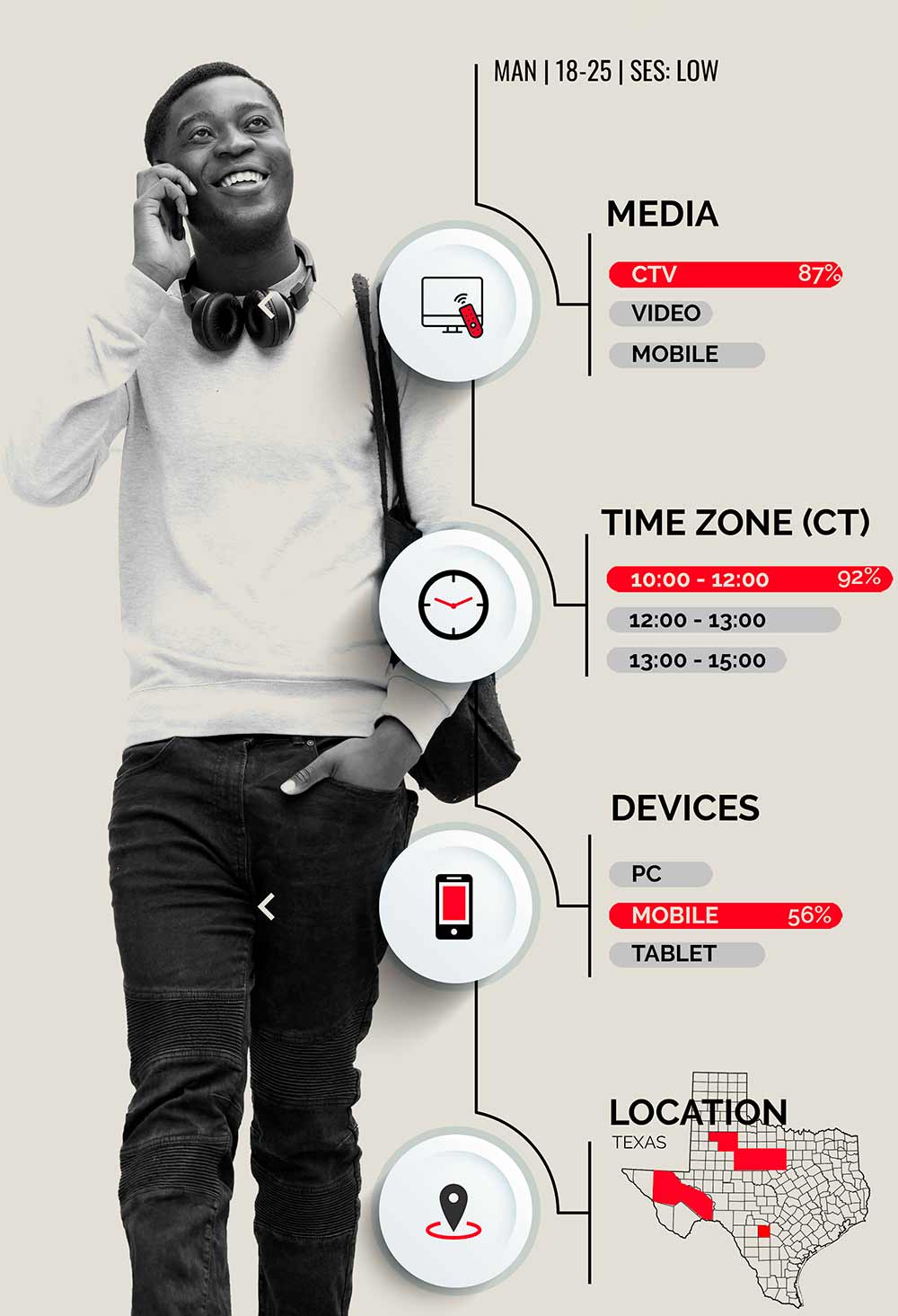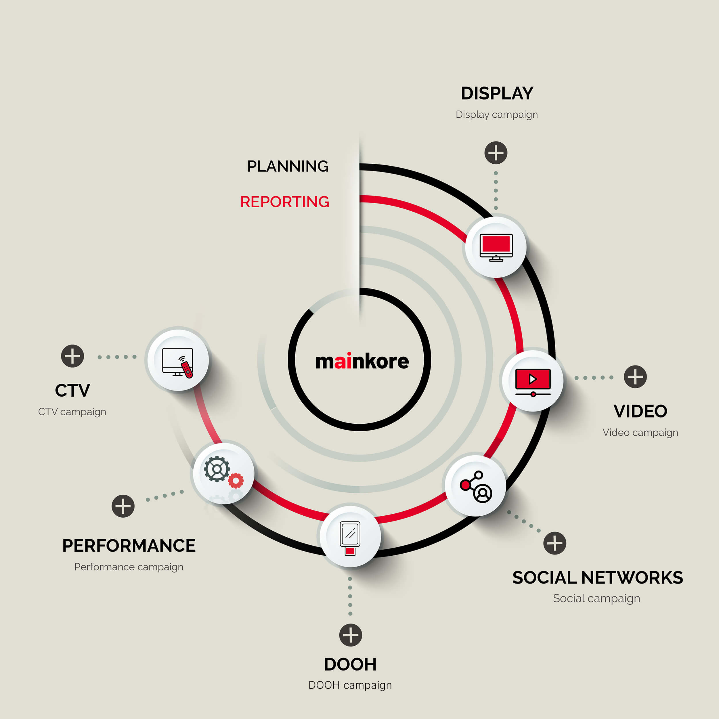 Mainkore uses data transversally to understand the user in a global, unique, and integrated way. From one platform, we can carry out 360 planning reaching audiences across all media (Desktop, Mobile, Radio, CTV, DOOH, etc.) in a simple and agile way. Thanks to the unified reporting system, Mainkore allows a holistic vision of consumer behavior, analyzing individuals and their relationship with the different mediums they use.
